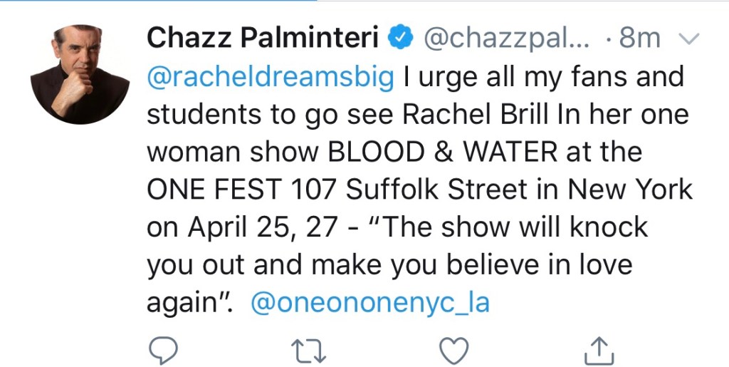 “Blood and Water was part of the official selection at The ONE Festival with Caceido Productions at Teatro Latea on NYC’s Lower East Side, where Rachel also had the opportunity to perform for Chazz Palminteri.